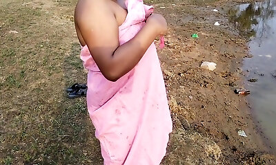 Indian house wifey bathing outside